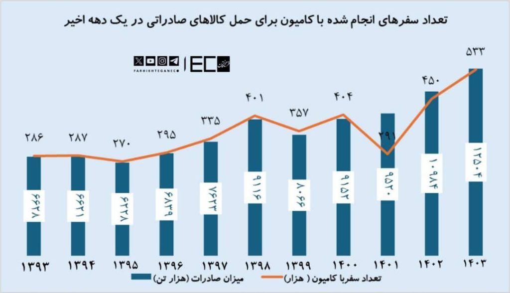 بر اساس آمارهای رسمی، میزان ترانزیت کالاهای صادراتی با کامیون از ۶.۶ میلیون تن در سال ۱۳۹۳ به ۱۲.۵ میلیون تن در سال ۱۴۰۳ افزایش یافته است. همچنین تعداد سفرهای کامیونهای صادراتی طی این مدت با رشد ۱.۸ برابری از ۲۸۶ هزار سفر به ۵۳۳ هزار سفر رسیده است.